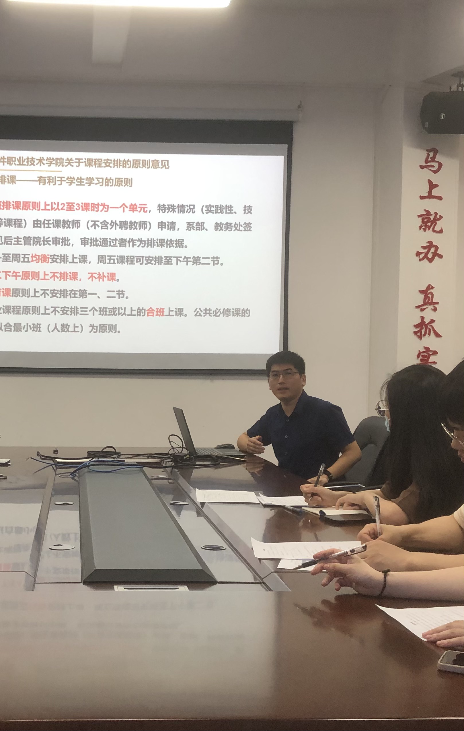 林土水副校长从教师教学状态、学生学习学情、课程性质特征、资源科学调度等方面说明课表合理性对促进教学质量提升具有重要作用。对下学期教务工作提出了新的要求,一是统筹协调各司其职,教务科研处要合理统筹分配资源,强化课表编排指导和过程监督工作;二是加强创新服务教改,各产业学院教研室要强化教学组织模式改革,如通信产业学院采取接力培养模式,直播专业采取“0.5+0.5”理实一体模式;三是强化研究提升质量,教务科研处和各教学单位负责人要从教务改革创新角度强化课题研究,提升服务水平。