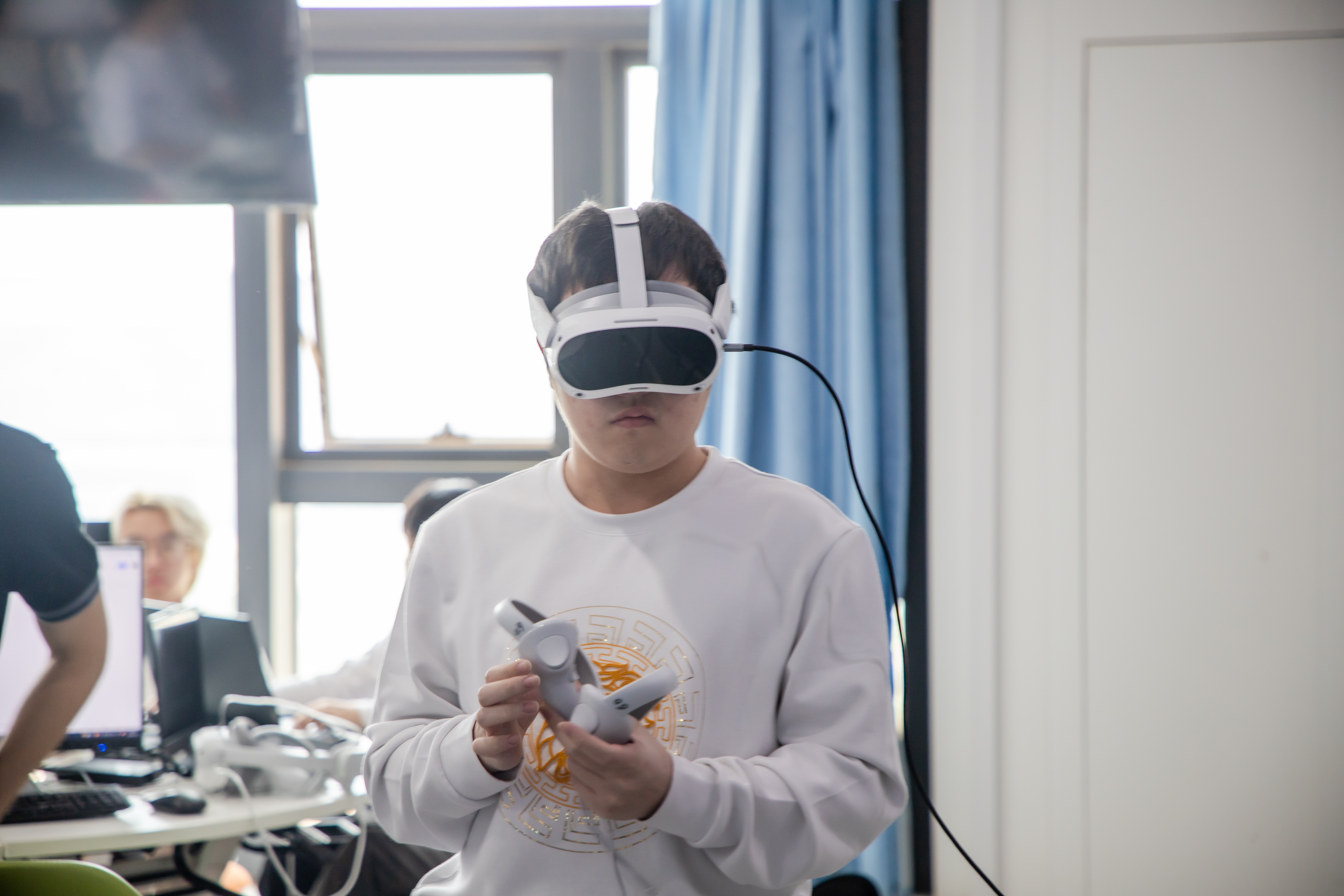 游戏产业学院周云飞老师展示了一堂将VR终端与元宇宙核心技术相结合的《VR交互设计》元宇宙公开课。周老师以学生为中心,要求学生借助元宇宙技术和设备将做好的元宇宙场景打包进PICO4运行。打包成功后,学生可以沉浸式体验设计场景。元宇宙情境下,具象化的场景引起了学生对本节知识点学习的浓厚兴趣。同时,周老师以问题为载体,采用“问题串”的形式,引导学生主动思考、探究PICO4 UI交互功能的使用方法,他的问题引导式教学方法让本节课紧凑充实,也真正让学生成为了课堂的主人。本次元宇宙公开课意在形成以学生为主体,教师为主导的数字化、多元化课堂,使师生沉浸于元宇宙场景开展教学活动,提高教学质量和教学效果。