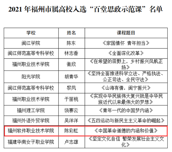 根据《福州市教育局关于公布2021年思政示范课遴选结果的通知 (榕教思〔2021〕35号)》文件获悉,我校马克思主义学院陈彩虹老师在2021年福州市属高校“百堂思政示范课”遴选活动中,选送课程《中国革命道德的内涵和价值》入选“百堂思政示范课”。