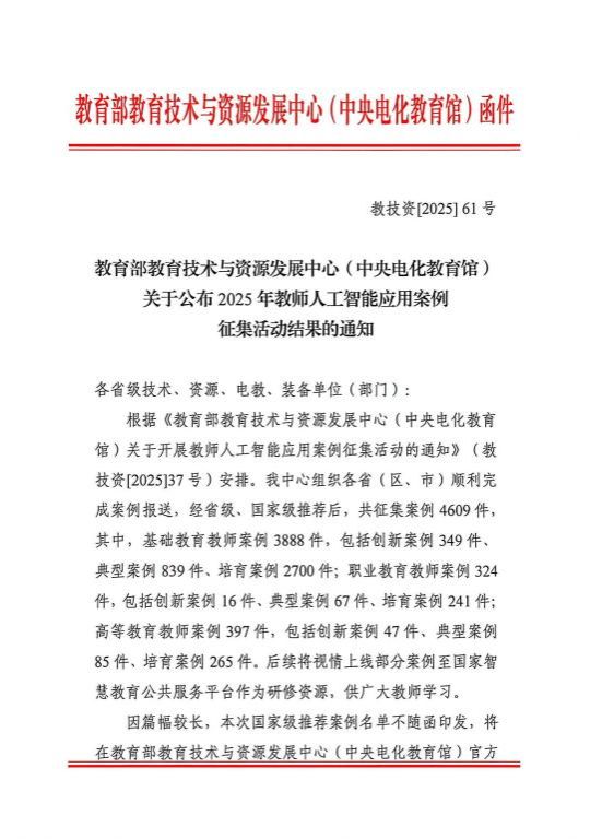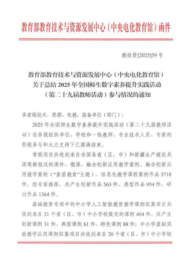 近日,教育部教育技术与资源发展中心(中央电化教育馆)主办的2025年全国师生数字素养提升实践活动(第二十九届教师活动)与2025年教师人工智能应用案例征集活动结果相继公布,我校多项成果入选并斩获佳绩,充分展现了学校在数智融合教学改革中的扎实成效。