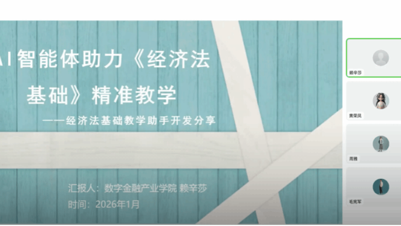 智能产业学院林荣鑫分享“课标通”智能体实现课程标准智能解析;数据产业学院邵坤鹏演示“育码评才”系统重构学生代码评价流程;数字金融产业学院赖辛莎、陈悦则以《经济法基础》课程为例,展示智能体在案例推送、习题生成方面的应用实效。