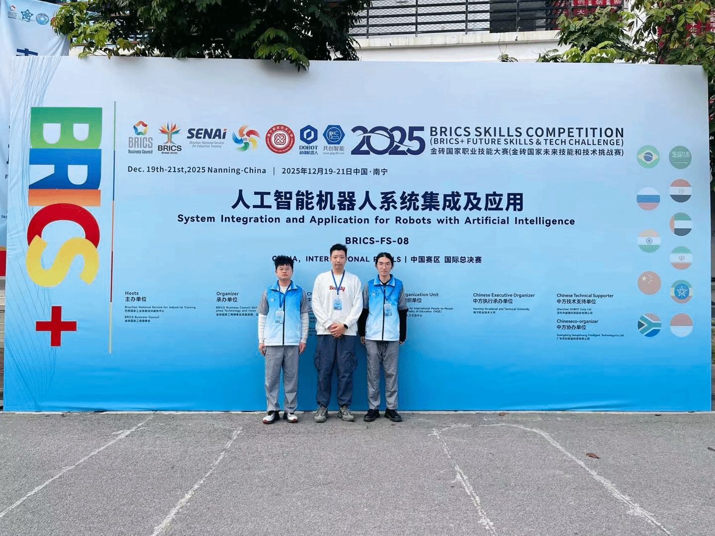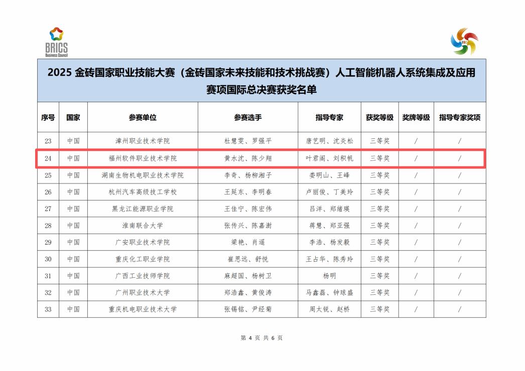 2025年12月21日,2025金砖国家职业技能大赛(金砖国家未来技能和技术挑战赛)人工智能机器人系统集成及应用赛项国际总决赛在南宁职业技术大学圆满落幕。福州软件职业技术学院学子黄水沈、陈少翔凭借扎实的专业功底、出色的实践能力和默契的团队协作,从中国、泰国、越南、印度尼西亚等多个国家的参赛队伍中脱颖而出,荣获大赛三等奖,充分展现了该校职业教育的育人成效和学子的国际竞争力。