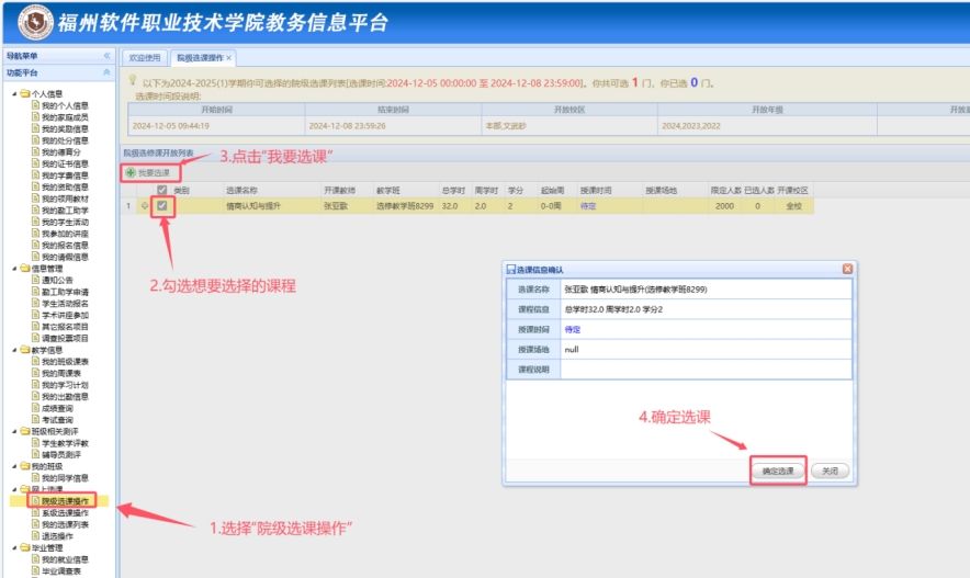 学生可登录学生教务平台网址:http://jw.fzrjxy.com/studentportal.php登陆账号为学号或身份证号。点击左侧“网上选课”-“院级选课操作”即可选课。选课时间截止后不再组织报名。