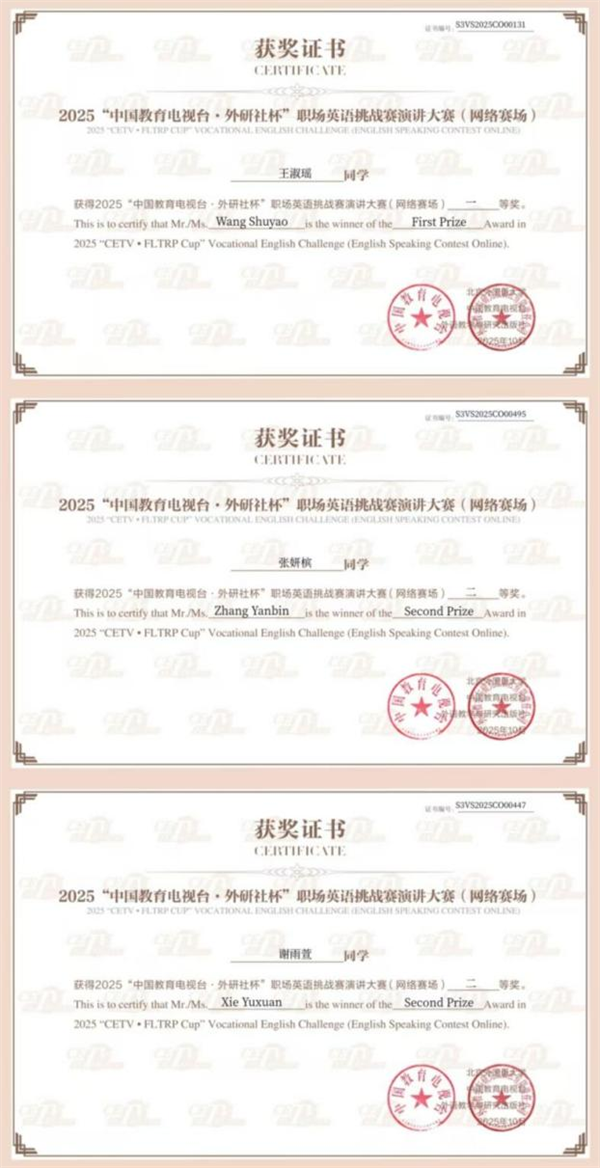 近日,2025年“中国教育电视台·外研社杯”职场英语挑战赛演讲大赛网络赛与写作大赛福建赛区决赛顺利落幕。在我校通识教育中心陈行舟老师和高颖老师的悉心指导下,同学们凭借着扎实的英语功底与出色的的职业素养,脱颖而出,荣获多项荣誉。